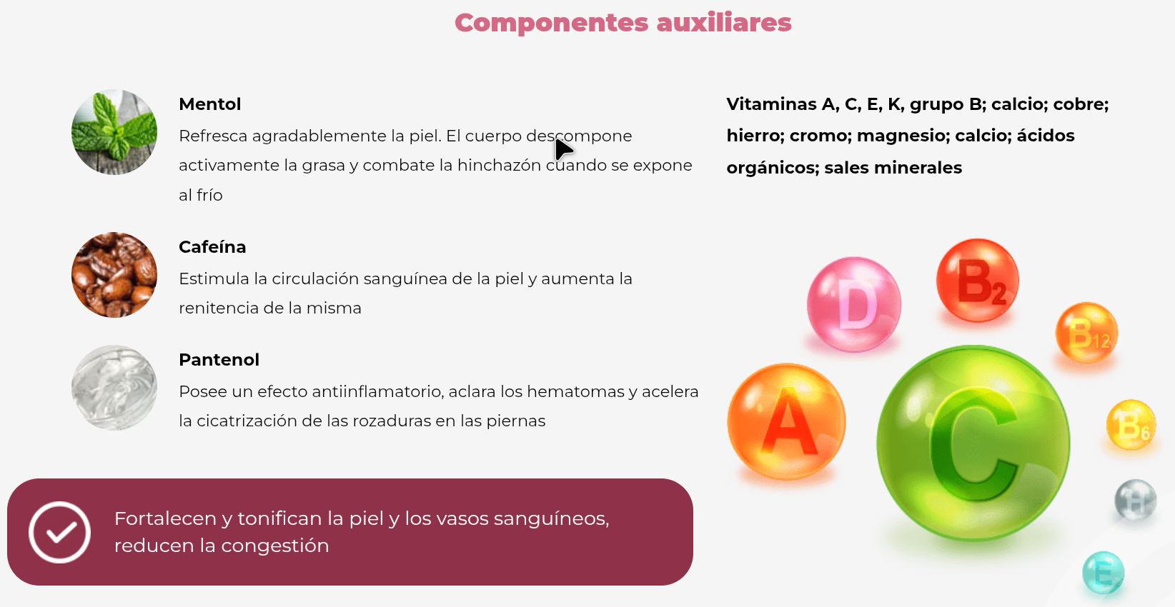 Su fórmula combina extractos naturales y activos ampliamente utilizados en cosmética corporal, como castaño de Indias, mentol, manzanilla, ortiga, cafeína y pantenol. Esta combinación da como resultado una textura ligera, de rápida absorción, no grasa y con un efecto refrescante inmediato al aplicar.